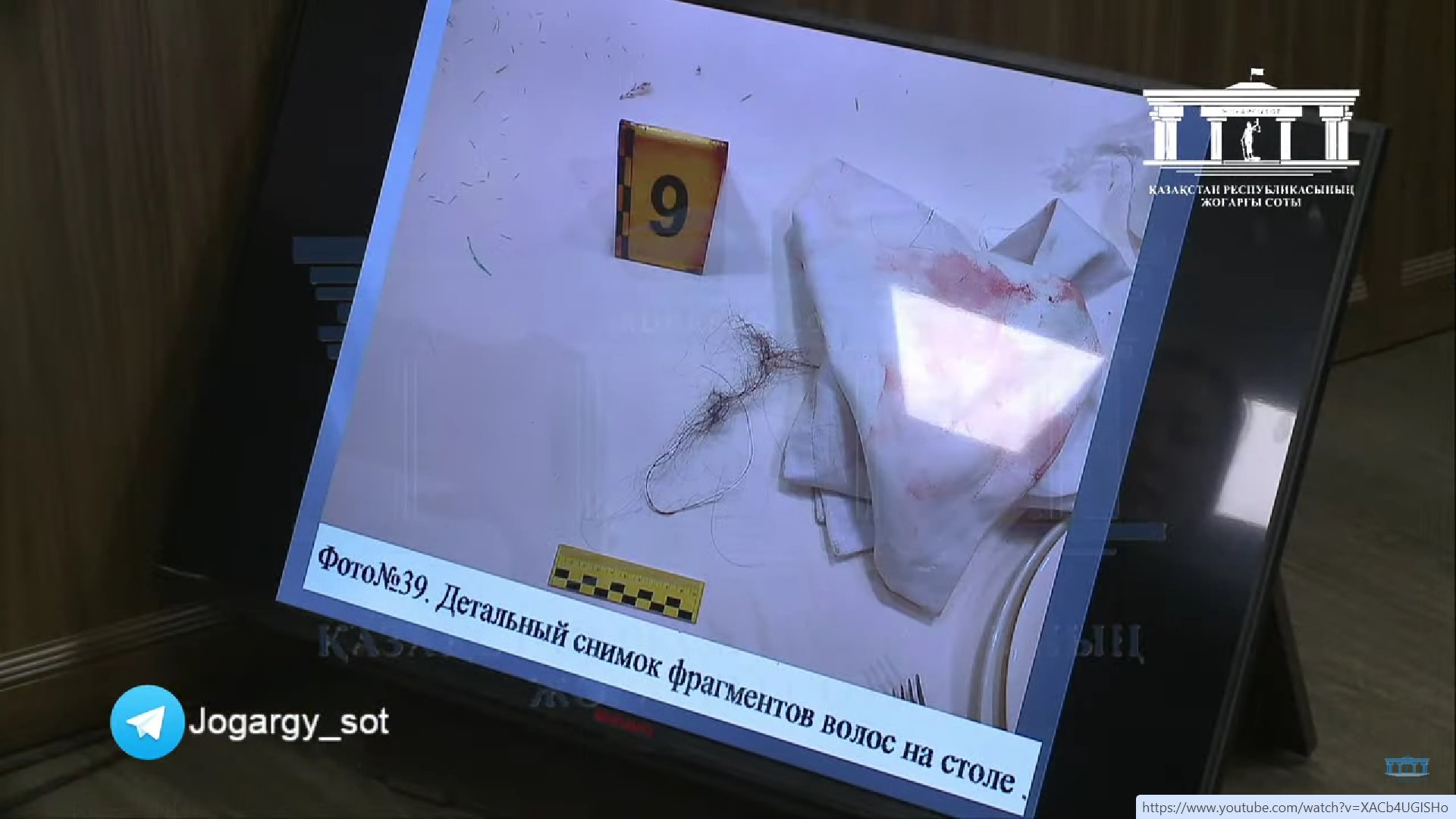 В ходе судебного процесса гособвинитель Айжан Аймаганова показала на экране в зале суда фотографии с места преступления, демонстрируя присутствующим улики, найденные следователями.