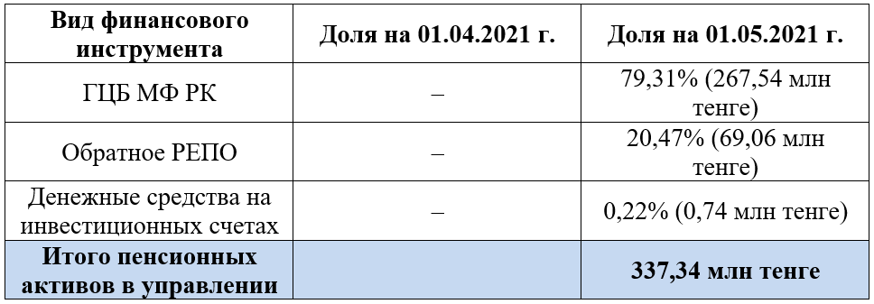 На 1 мая портфель составил 337,34 млн тенге, большая часть вложена в ГЦБ минфина. Меньшая часть – одна пятая портфеля – в операции обратного РЕПО, также с ценными бумагами министерства финансов РК.