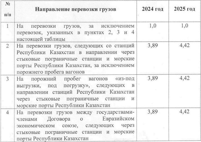 "27 ноября 2023 года по итогам совещания по вопросам АО "Национальная компания "Қазақстан темір жолы" премьер-министром республики Казахстан поручено министерству национальной экономики республики Казахстан совместно с министерством транспорта республики Казахстан и АО "НК "КТЖ" (по согласованию) проработать вопросы применения механизма ценовых пределов к тарифу на услуги магистральной железнодорожной сети для транзитных перевозок грузов в границах стран Евразийского экономического союза с 20 декабря 2023 года и для экспортных перевозок грузов в I квартале 2024 года". В связи с этим просим утвердить величины максимального индекса к тарифам на регулируемые услуги магистральной железнодорожной сети по отдельным направлениям перевозок грузов согласно нижеуказанной таблице", – говорится в документе.