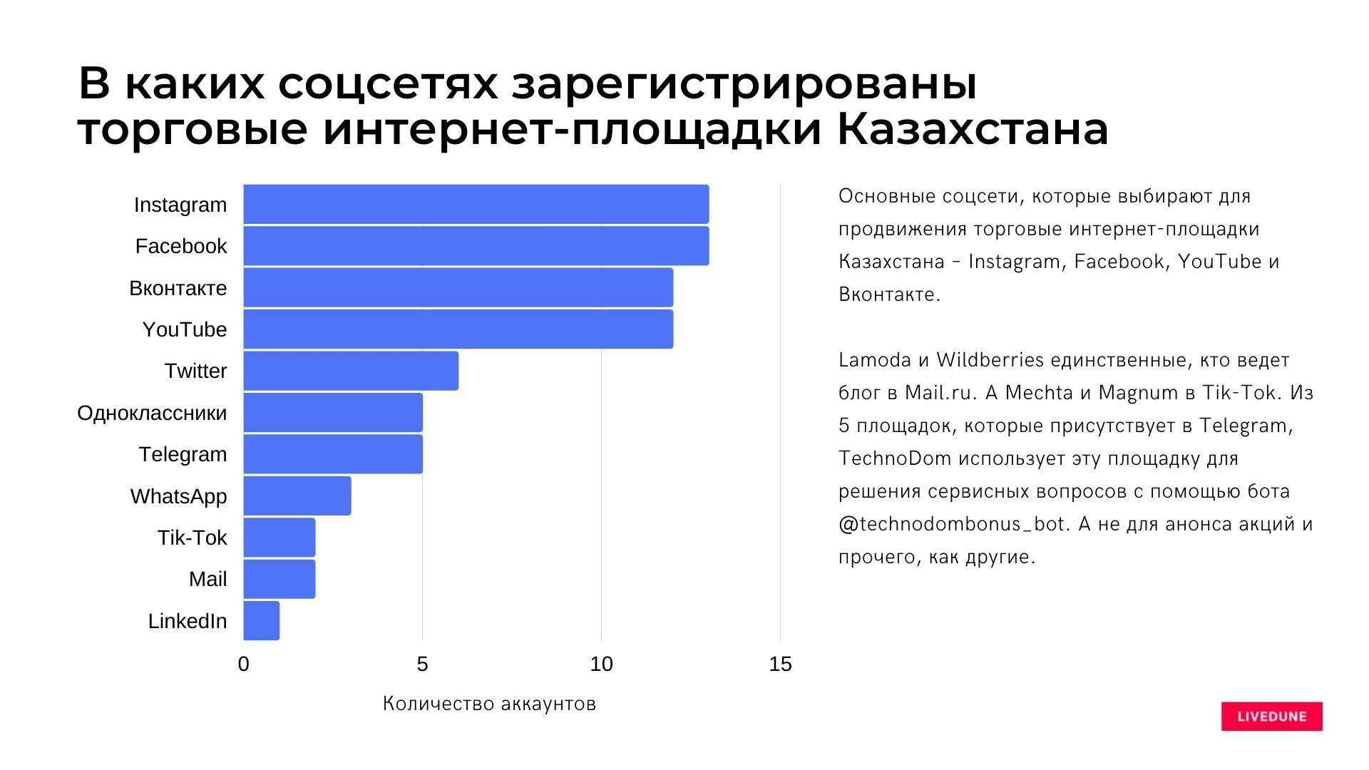 Сервис аналитики социальных сетей LiveDune провел любопытное исследование страниц крупнейших торговых интернет-площадок Казахстана и выяснил, какая из них самая активная, под чьими постами оставляют больше всего комментариев и почему, а также — кто ведет блог в Mail.ru. Разберемся, что к чему.