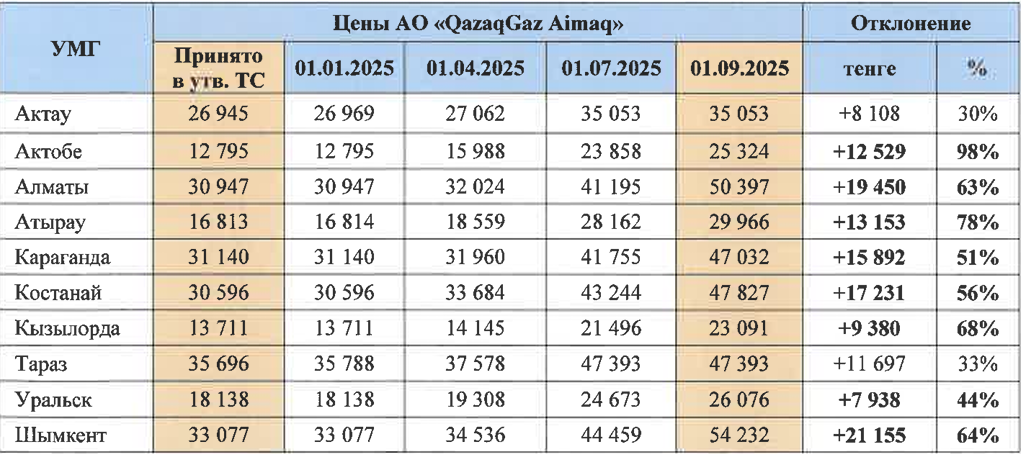 "В проекте тарифной сметы на 2022-2026 годы изменены только расходы по статьям газ на СНиП (здесь, предположительно, имеются в виду "собственные нужды и потребление", а не "строительные нормы и правила". – Прим.), оплата труда в производственном и административно-управленческом персонале. Изменения предусмотрены с 2025 по 2026 год с учетом коэффициента инфляции. Изменение стоимости стратегического товара – в 2025 году цены розничной реализации товарного газа АО QazaqGaz Aimaq (газораспределительная и сбытовая "дочка" QazaqGaz. – Прим.) менялись 4 раза в сторону увеличения", – аргументируется в выкладке, где в таблице выложена динамика изменения стоимости газа.