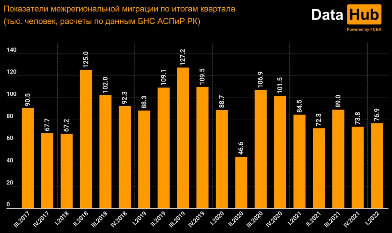 В I квартале текущего года в другой регион на постоянное место жительство переехало 76 944 гражданина РК. И это самый низкий показатель для января-марта за последние 4 года. А ведь годом ранее он составлял около 84,5 тыс. человек.
