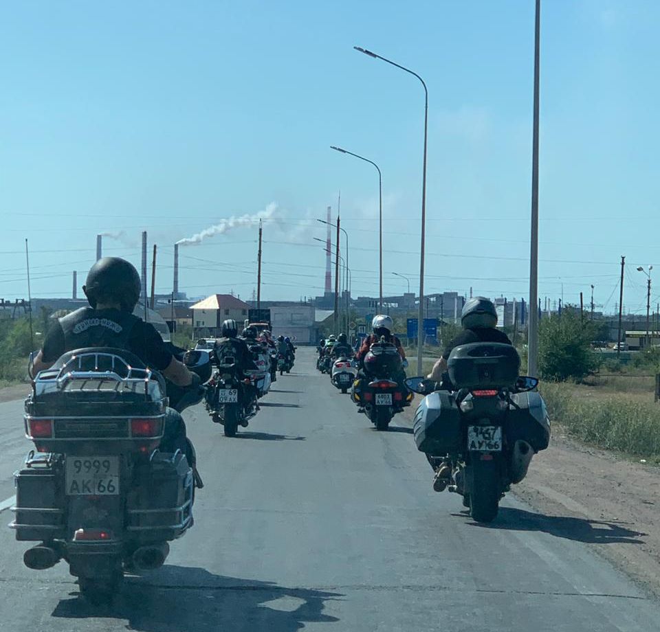 Его проводит Екатеринбургский мотоклуб "Черные ножи", участники которого уже побывали в нескольких города Казахстана и движутся к Алматы.