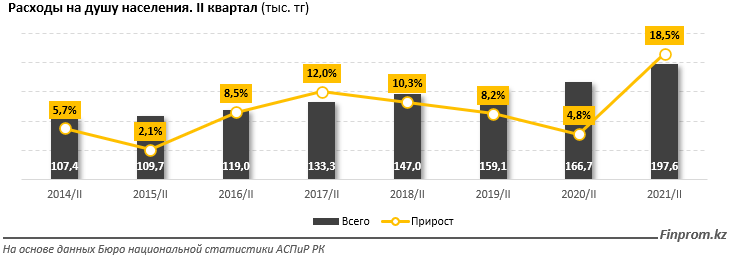 Для сравнения: в аналогичном периоде 2020 года расходы населения составляли 166,7 тыс. тг, плюс 4,8% за год.