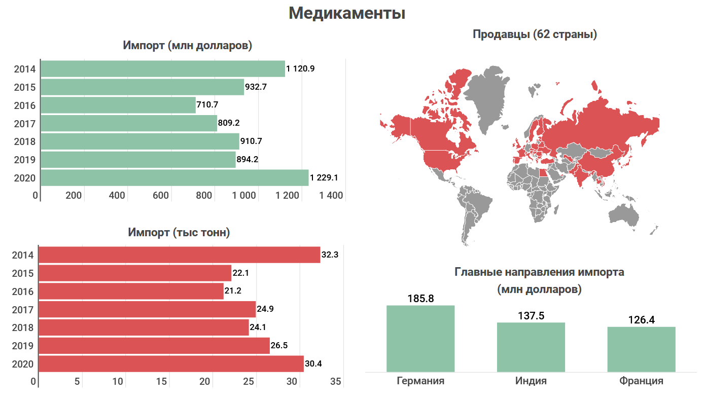 Официально медикаменты в республику поступают из 62 стран. При этом рынок достаточно диверсифицирован – на 5 крупнейших поставщиков (Германия, Индия, Франция, Россия и Италия) приходится лишь 50% всего импорта. По сравнению с остальными товарами это очень низкий показатель.