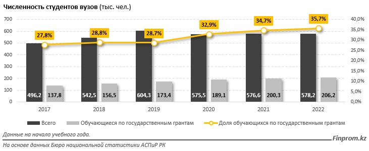 За последние пять лет в Казахстане на 49,6% выросла численность студентов, которые учились по государственным образовательным грантам. Если в сентябре 2017 года их насчитывалось всего 137,8 тыс. человек, то к 2022-му численность обладателей грантов увеличилась до 206,2 тыс. обучающихся. Об этом сообщает Finprom.kz, передает inbusiness.kz.