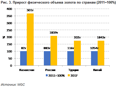 В относительном выражении Казахстан лидирует (рост в 3,7 раза, или на 219 тонн) по объёму прироста золота в резервах, тогда как в абсолютных значениях превалируют покупки со стороны России (+956 тонн за последние шесть лет) и Китая (+789 тонн за последние шесть лет). В структуре золотовалютных резервов Нацбанка Казахстана доля золота достигла 42%, следует из данных регулятора. По физическому объёму накопленного золота в резервах Нацбанка Казахстан занял 15-е место среди центробанков мира, опередив показатели Саудовской Аравии и Великобритании.