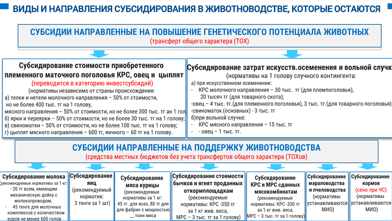 По субсидированию повышения генетического потенциала сельхозживотных в проекте выделено два направления: дотирование стоимости приобретенного племенного поголовья и затрат на искусственное осеменение и вольной случки. На это будут направлены деньги по трансферту общего характера. Но по первому направлению предлагается установить одинаковые нормативы независимо от страны происхождения животных. По всем видам животных планируется выплачивать 50% от их стоимости, причем с уточнением, например, по телкам и нетелям молочного направления не более 400 тыс. тенге за одну голову, по мясному направлению не более 300 тыс. тенге. Ярки и переярки не выше 30 тыс. тенге за голову, свиноматки – не более 100 тыс. тенге, цыплята мясного направления – 600 тенге, а яичного всего 60 тенге. Что касается осеменения, то сумма варьируется от 3 тыс. до 30 тыс. тенге в зависимости от вида сельхозживотного.