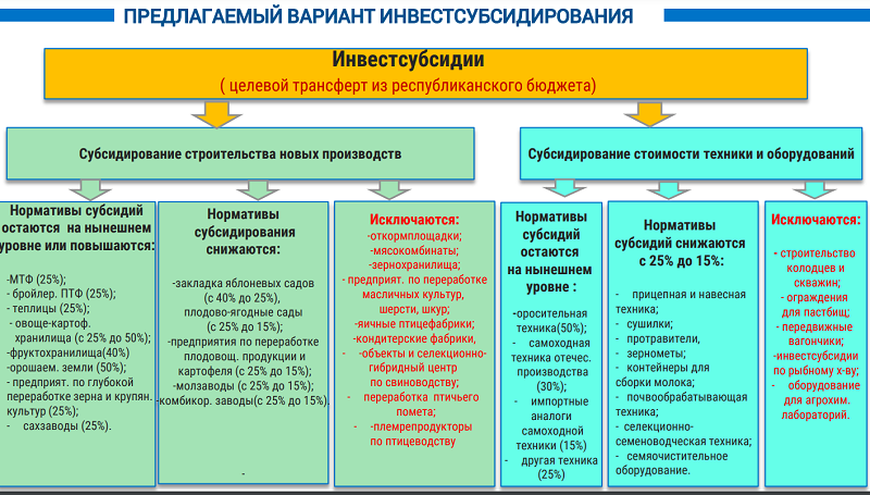 Разработал минсельхоз и вариант по инвестсубсидированию, которое будет идти как целевой трансферт из республиканского бюджета, но разбил виды на три группы: нормативы остаются на прежнем уровне или повышаются, снижаются и исключаются. По первой группе на уровне 25% от стоимости строительства новых объектов остаются дотации на молочно-товарные фермы, бройлерные птицефермы, теплицы, сахарные заводы и предприятия по глубокой переработке зерна и крупяных культур. Вырастет возмещение затрат до 50% по орошаемым землям и овощехранилищам, а по фруктохранилищам – до 40%.