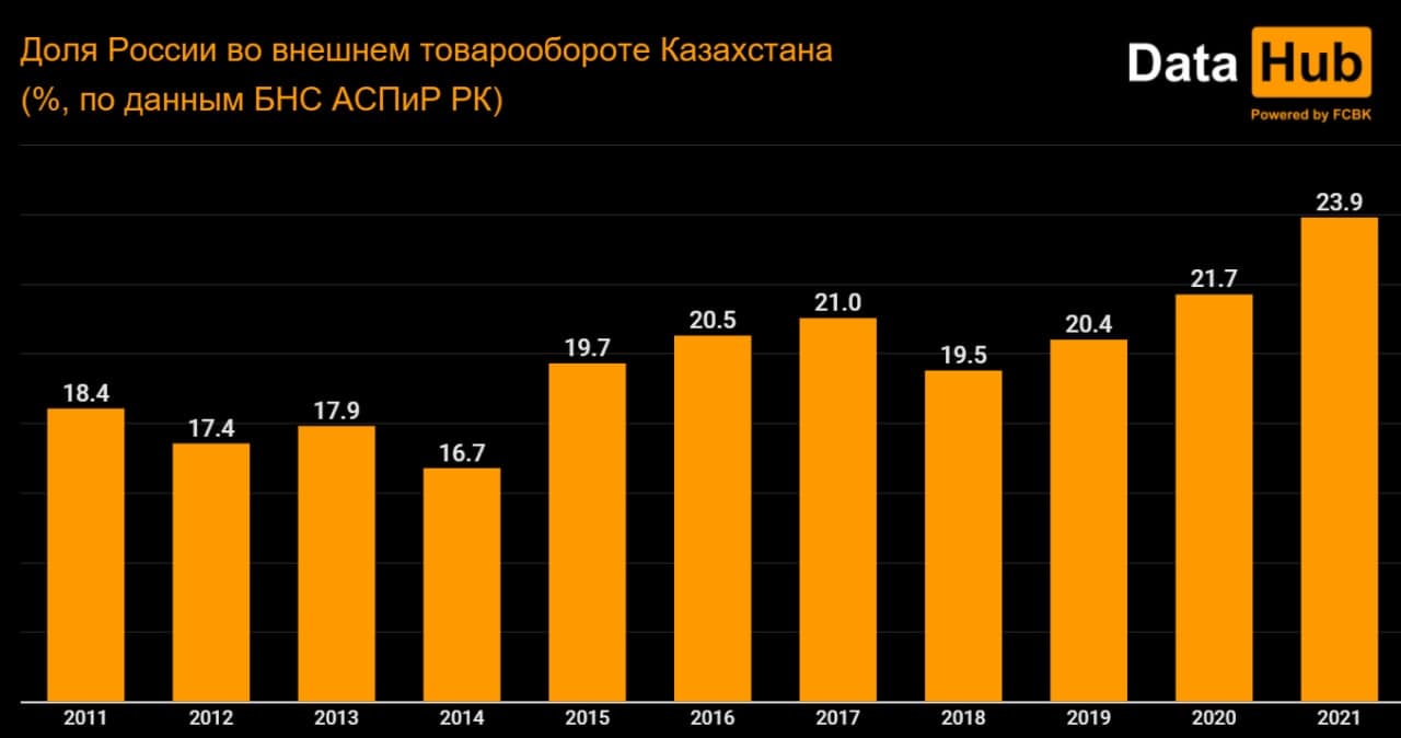 В целом доля товаров из РФ в импорте РК на 2021 год составляет порядка 42%. В прошлом году каждый девятый доллар, заработанный Казахстаном на экспорте, был оплачен Россией. А два из пяти долларов, потраченных Казахстаном на покупку товаров за рубежом, ушли в РФ.