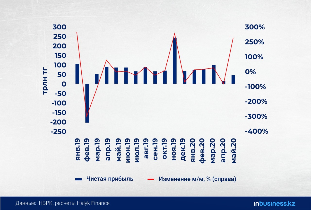 Наибольшие доходы за май 2020 года продемонстрировали Халык Банк – Т21,7 млрд (Т122,1 млрд с начала года, 39,6% от прибыли сектора с начала года) и Kaspi – Т17,1 млрд (T91,2 млрд, 29.5%). Следующие банки завершили месяц с убытком: Jýsan Bank, Евразийский, Нурбанк, Capital Bank, Азия Кредит, Банк Пакистана. Об этом говорится в отчете Halyk Finance по финансовым показателям банковского сектора по итогам мая 2020 г.
