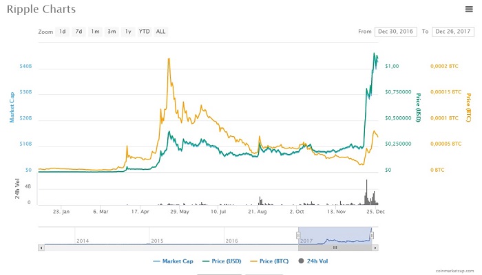 К примеру, 30 декабря 2016 года ripple торговался на уровне 0,006 цента за одну единицу. На момент публикации материала криптовалюта, по данным биржи EXMO, стоит 1,03 USD. Если бы вы вложили 100 долларов год назад, сегодня бы получили более 16000 долларов. По капитализации ripple занимает четвертое место с 39 миллиардами долларов.