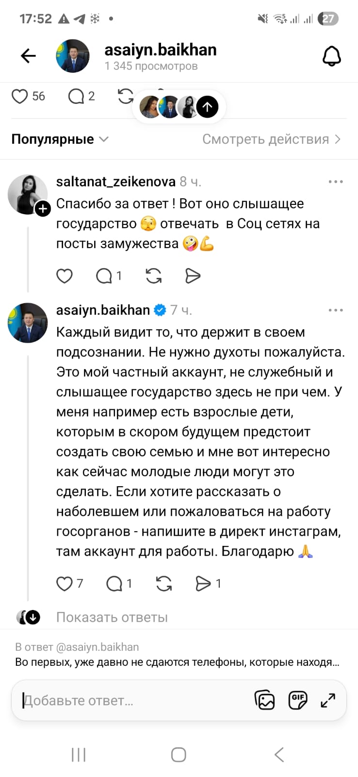 На этом их полемика не завершилась. Девушка саркастически заметила, что ответы акима в Threads на посты о замужестве – показатель слышащего государства.