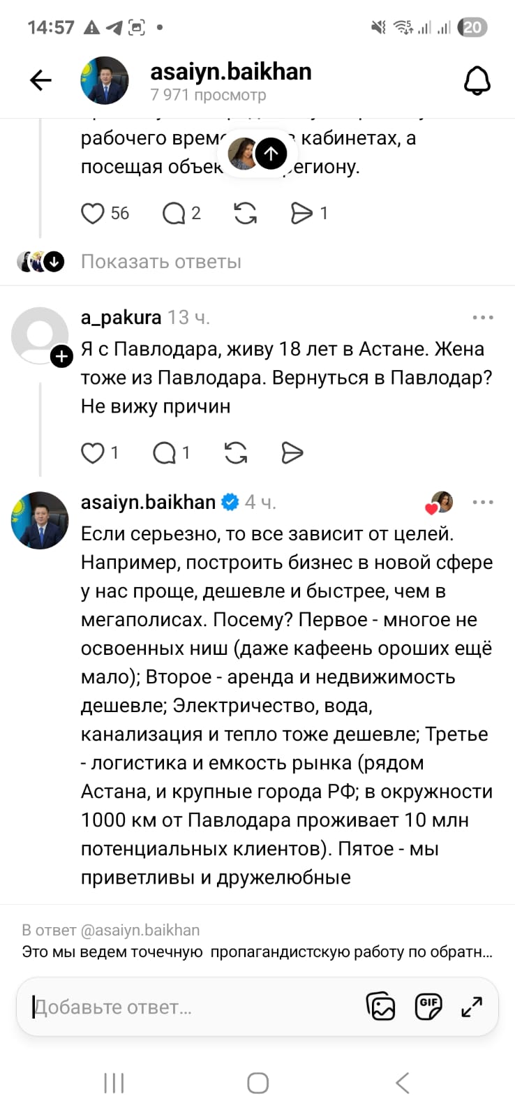 Также комментарии акима были замечены под постами павлодарцев, которые уже не живут в родном городе, но рассматривают вариант возвращения и просят совета по этому поводу.