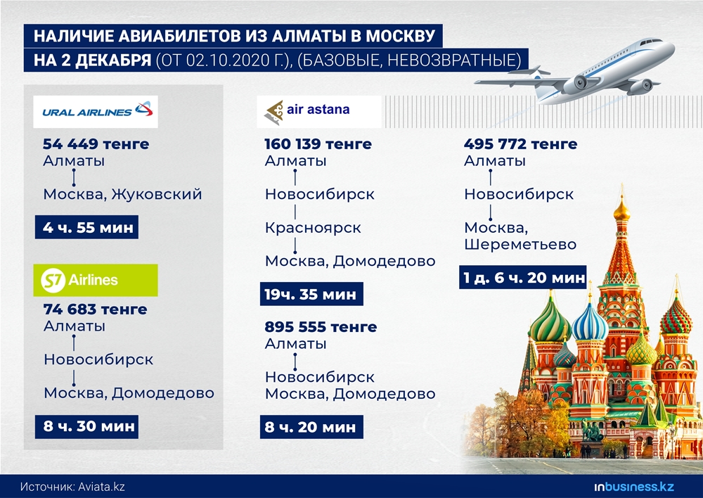 Сервис-агрегатор Aviata.kz на 2 декабря предлагает "самый быстрый и самый дешевый" – от "Уральских авиалиний" из Алматы – за 55 тысяч тенге. У компании S7 Airlines на эту же дату можно купить билет с пересадкой в Новосибирске за 75 тысяч тенге. Есть на эту дату и "Эйр Астана" – но бортом российской S7 Airlines (в рамках соглашения авиакомпаний), и это будет рейс через Новосибирск и Красноярск до Домодедово – за 160 тысяч тенге, либо с одной пересадкой в новосибирском аэропорту Толмачово – за 495 тысяч тенге, либо по тому же маршруту, но вдвое дороже за то, что пассажир получает "минус один день транзитного ожидания". Из Нур-Султана на эту дату пока в наличии билеты на прямой рейс до Москвы по стоимости в 294 тысячи тенге.