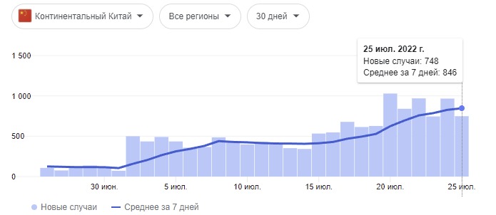 Что касается коронавируса, то на данный момент значительный рост количества заражений наблюдается в Китае, главном мировом импортере нефти. С начала июля средненедельное число заражений COVID-19 в сутки в Китае выросло со 105 до 846. Это крошечное число, если сравнивать число заражений относительно общего количества населения, однако, учитывая китайскую политику "нулевой терпимости" к коронавирусу, это может спровоцировать новые локдауны в Поднебесной.
