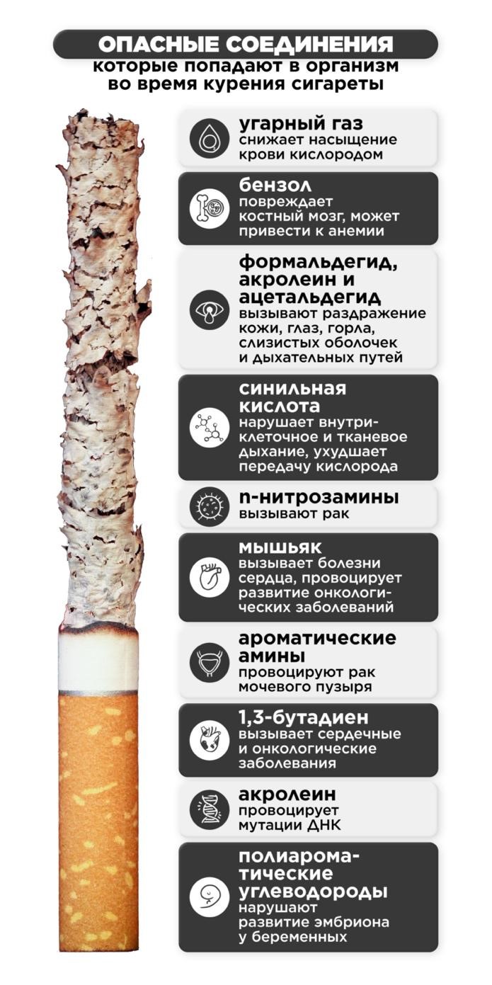 Среди химических соединений, содержащихся в табачном дыме, насчитывается около 70 особо опасных. Это канцерогены – вещества, которые провоцируют развитие раковых опухолей. К канцерогенам относятся цианид, мышьяк, бензол, формальдегид, метанол, ацетилен и др.