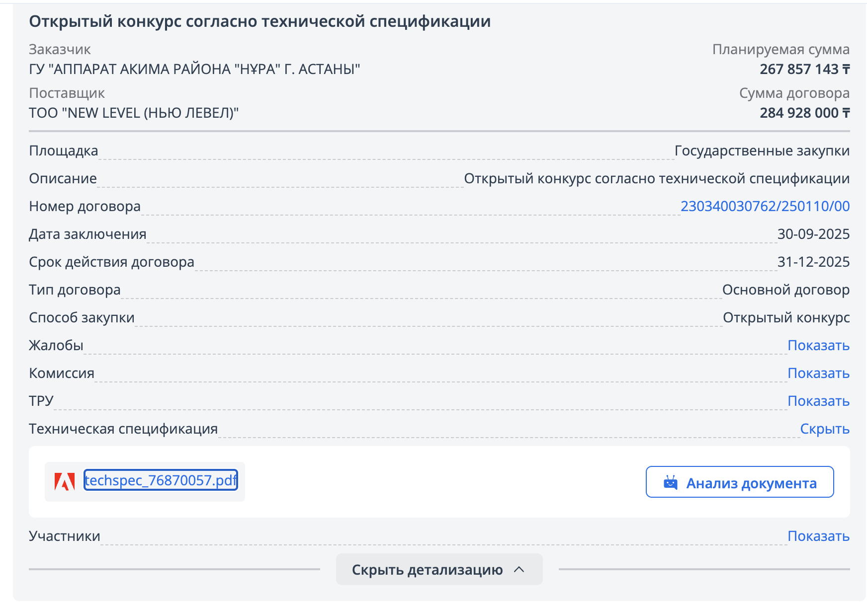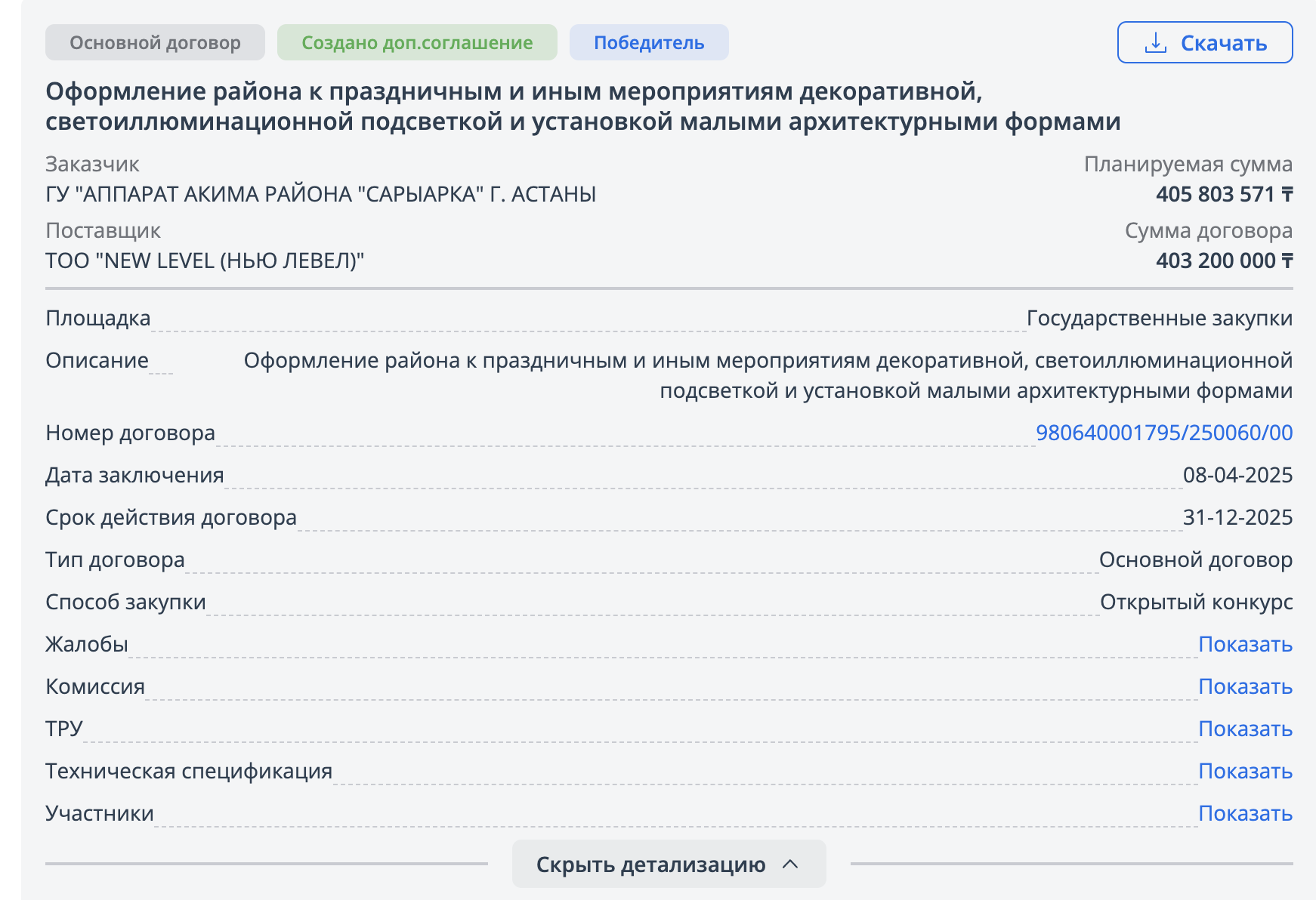 Победителем вновь оказалось уже знакомое нам ТОО NEW LEVEL, а сумма контракта составила внушительные 403,2 млн тенге.