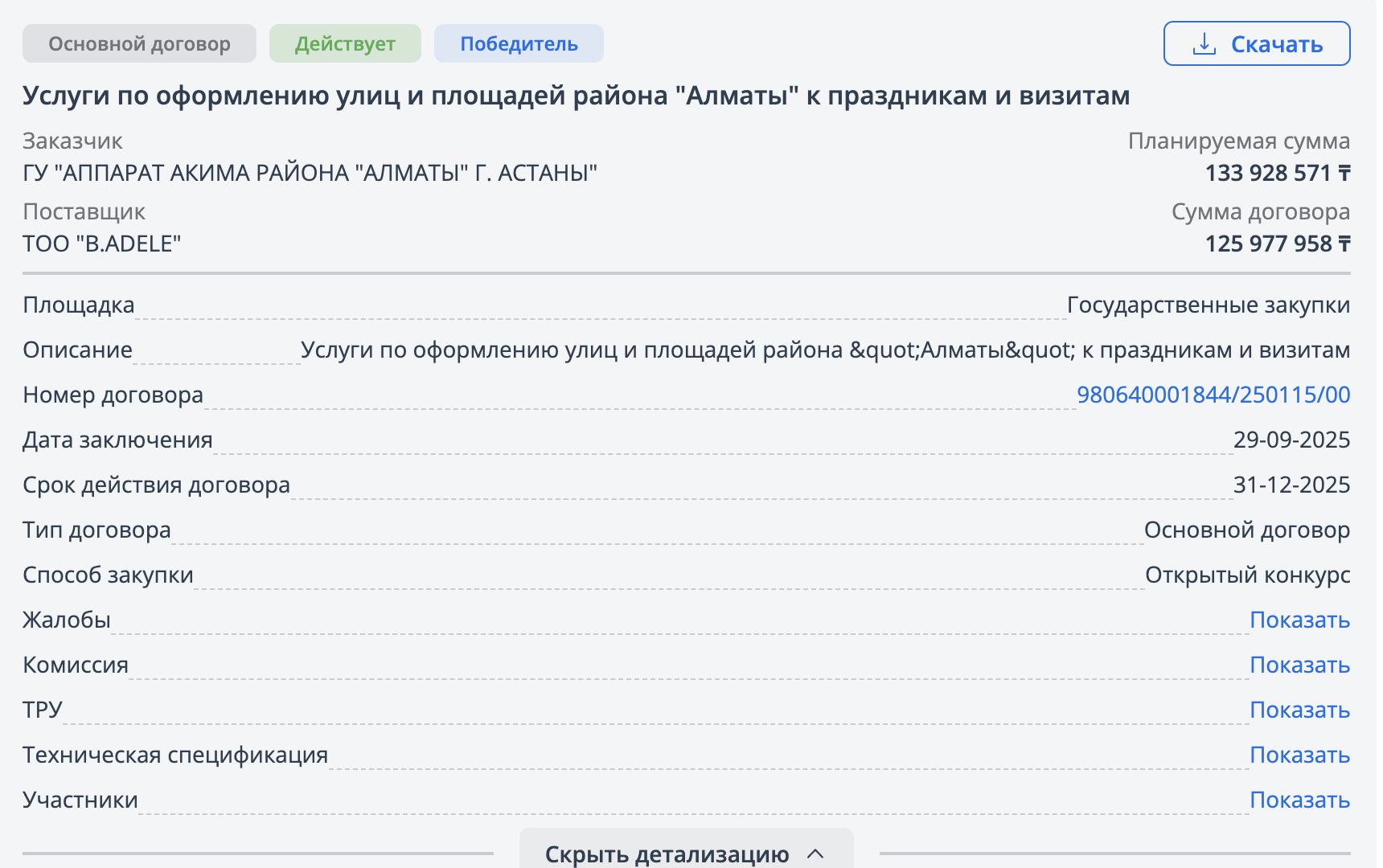 Тем не менее данные портала Adata.kz показывают иную картину. Еще 29 сентября 2025 года районом был заключен контракт на сумму 125 млн 977 тыс. 958 тенге. Подрядчиком выступило ТОО B.ADELE, а предметом договора значатся "услуги по оформлению улиц и площадей района Алматы к праздникам и визитам". Действие договора распространяется до 31 декабря 2025 года.