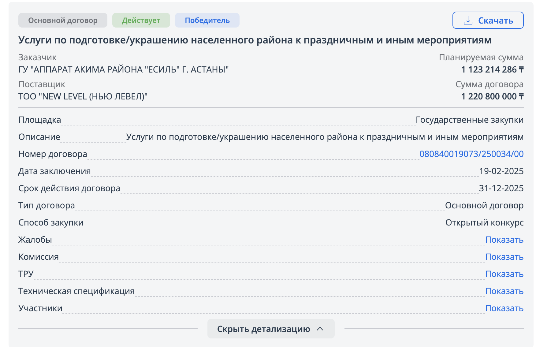 Молодой район столицы – Нура – подошел к вопросам праздничного бюджетирования заблаговременно. Администрация района закрыла вопрос с подрядчиком еще в начале делового сезона: 30 сентября 2025 года был заключен договор с ТОО NEW LEVEL, как и в случае с Есильским районом.