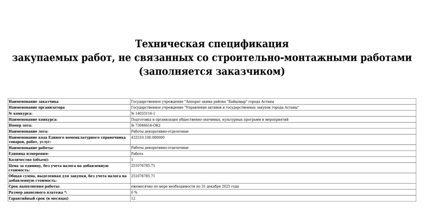 Редакция Inbusiness.kz обнаружила еще один крупный контракт этого района, заключенный еще в феврале 2025 года, на "подготовку и организацию общественно значимых культурных мероприятий". Его сумма составила 251 млн 076,7 тыс. тенге.
