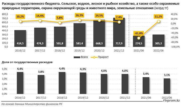 Для справки: за январь–декабрь 2021 года затраты государственного бюджета в секторе выросли на 7,4%, до 717,9 млрд тг. Доля АПК в общих затратах госбюджета варьируется в коридоре 3,1%–4,4%.