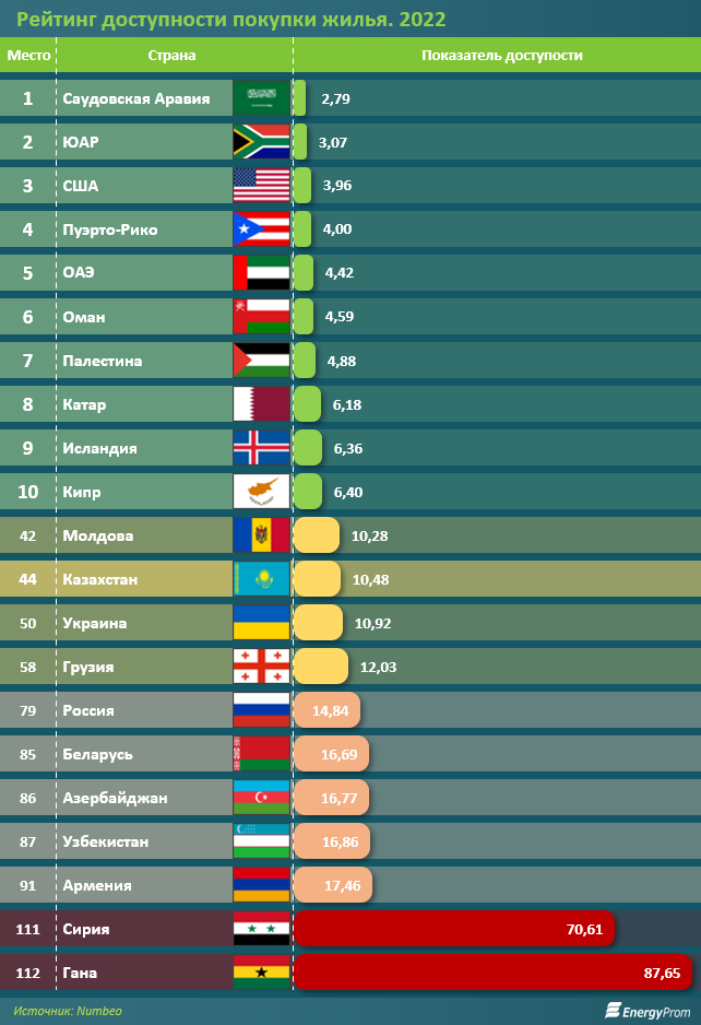 Для сравнения: расчёты для лидирующей тройки стран – Саудовской Аравии, ЮАР и США – показывают, что в них средняя стоимость жилья укладывается менее чем в четыре годовых дохода среднестатистической семьи.