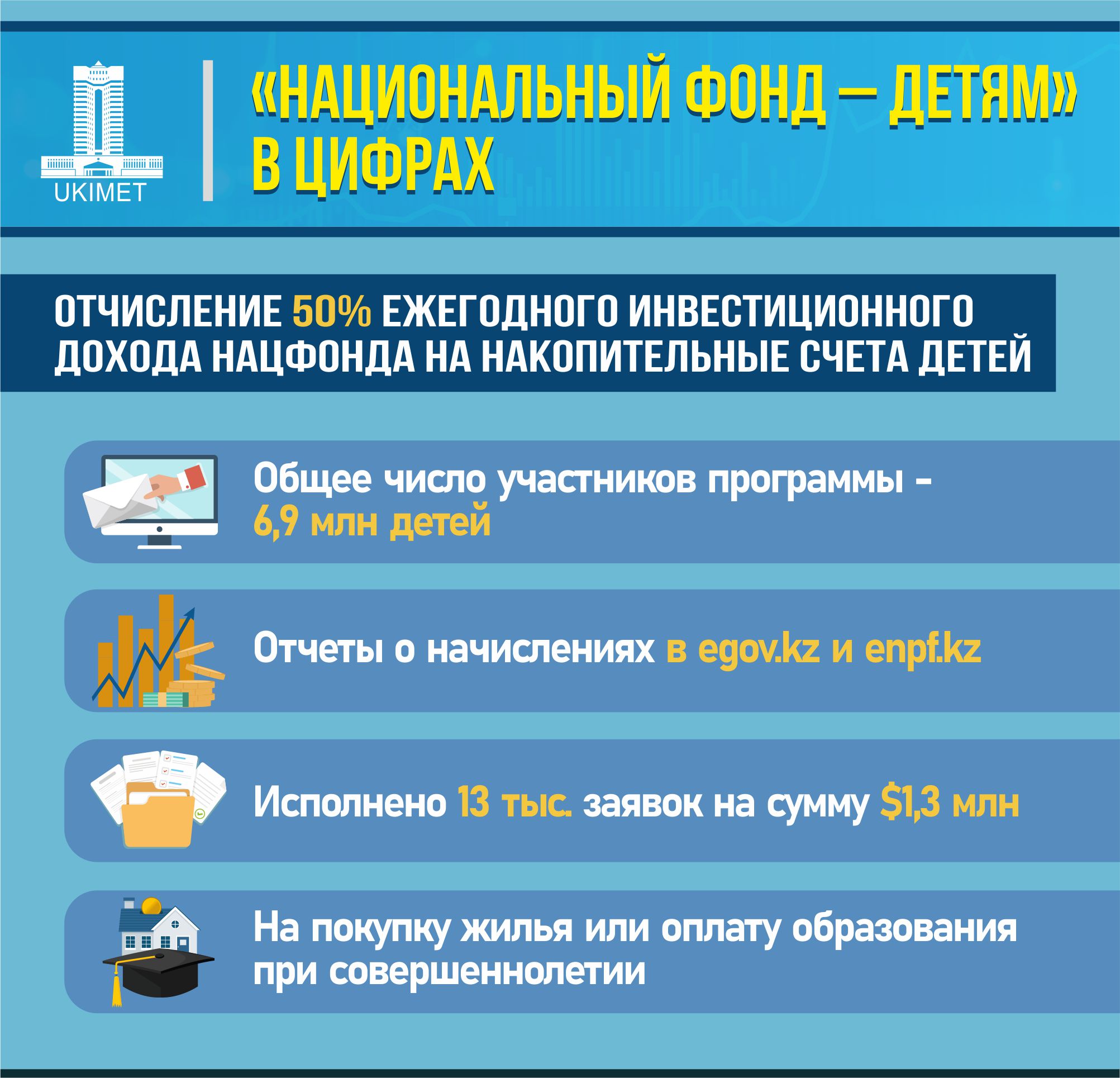 В феврале 2024 года казахстанские дети получили первые выплаты из Национального фонда. Инициированный президентом проект "Национальный фонд – детям" предусматривает отчисление 50% ежегодного инвестиционного дохода Нацфонда на накопительные счета детей до 18 лет. Основные направления их использования – улучшение жилищных условий и оплата образования.