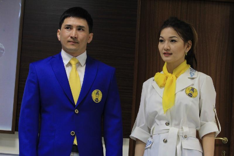 В комплект мужской парадной формы входят классический синий пиджак, белая рубашка, белые брюки, желтый галстук, в женский - белый жакет, синяя юбка и желтый платок. В комплект также входят бежевая спортивная обувь - слипоны, дорожная сумка и зонт. Все комплекты были выполнены ТОО "Казлегпром-Алматы" из итальянских тканей.