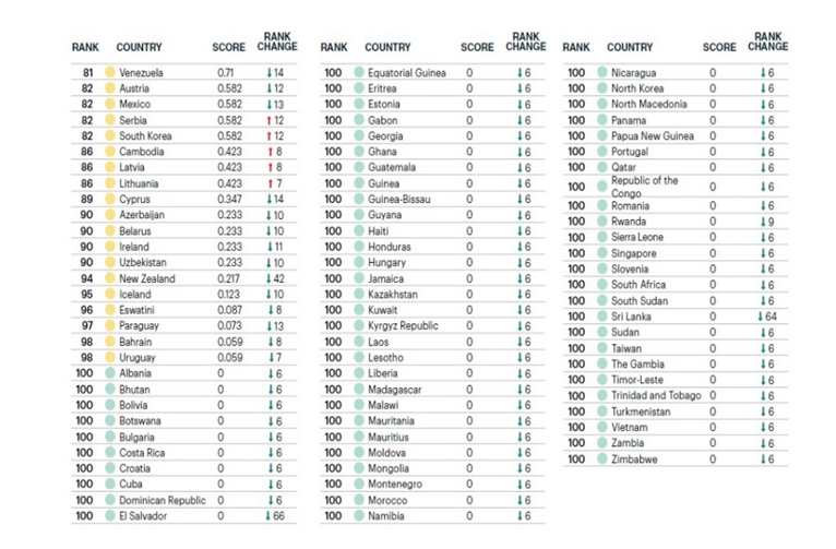 Уровень безопасности в РК (100 место с нулевым индексом угрозы) оценен выше, чем в ряде стран Запада (США, Канада, Британия, Франция, Германия, Испания), а также России, Китае, Азербайджане, Узбекистане, Таджикистане, ОАЭ, Турции.