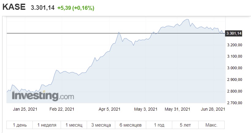Что касается казахстанского фондового рынка, то в течение последней недели индекс KASE начал корректироваться. За короткую с учетом праздничного дня неделю индекс Казахстанской фондовой биржи опустился на 1,46%. По итогам вчерашних торгов он зафиксировался на отметке в 3295 пунктов. В ходе сегодняшних торгов индекс KASE пока прибавляет несколько пунктов и растет до 3301 пункта.