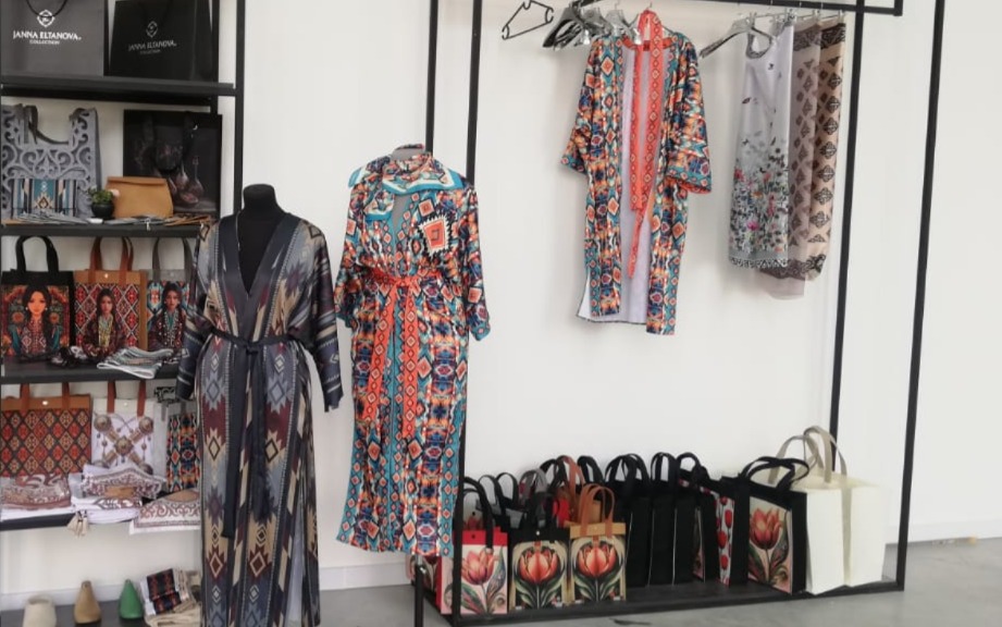 В запущенном корпусе, помимо офисных помещений, функционирует текстильный цех — это первая ступень из пятиэтапного плана развития производства. Сегодня предприятие, работающее под маркой Janna Eltanova, выпускает шелковые платки, войлочные сумки и активно готовится к освоению нового ассортимента: стеганых национальных чапанов с уникальными авторскими принтами. Оборудование для стежки уже заказано в Китае.