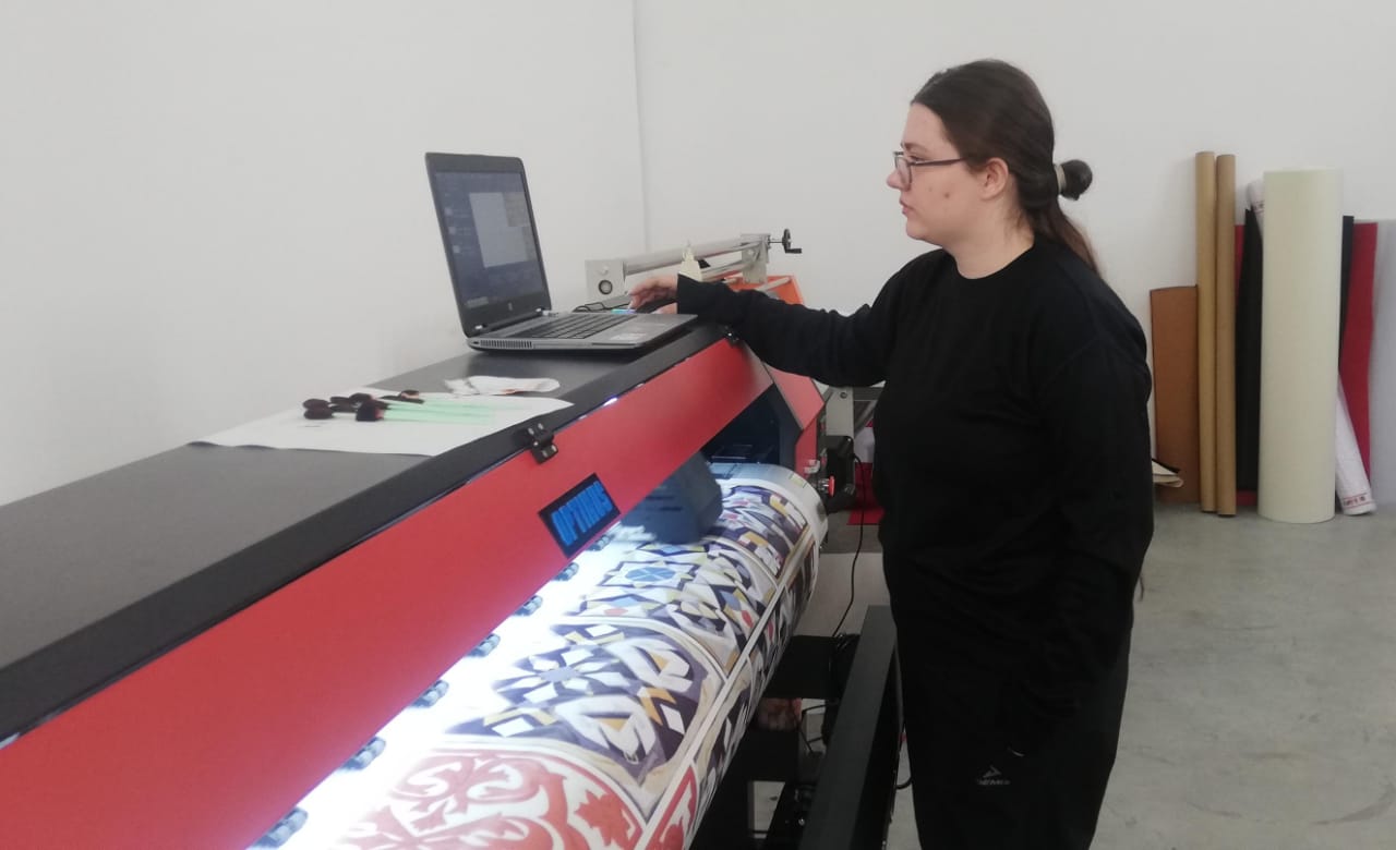 На производстве заняты десять специалистов — дизайнеры, швеи и программист. Здесь современное оборудование, такое как станки и цифровые принтеры, органично сочетается с ручной работой художниц.