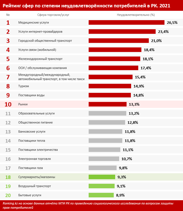 Однако важнее здесь даже не уровень удовлетворенности, а обратный показатель — степень неудовлетворенности потребителей. И здесь рынки РК вошли в десятку сфер-антилидеров по оценкам респондентов. Весьма не удовлетворены услугами рынков сразу 13,3% потребителей. В отдельных регионах показатели рынков еще хуже: так, в Астане работу рынков оценили как неудовлетворительную 27,7% опрошенных, в Алматы — 23,1%, в Жамбылской области — 22,6%.