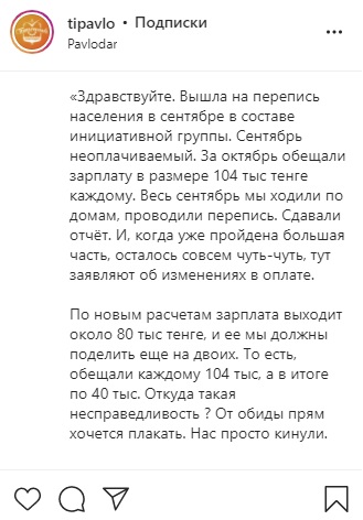 "Оплату мы проводим по факту выполненных работ. В сентябре при акиматах были собраны инициативные группы. С этими группами договоры не заключались. Они работали от акимата. Оплату им акимат, конечно же, не делал, поскольку они – инициативная группа", - ответили в пресс-службе департамента статистики Павлодарской области.