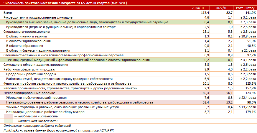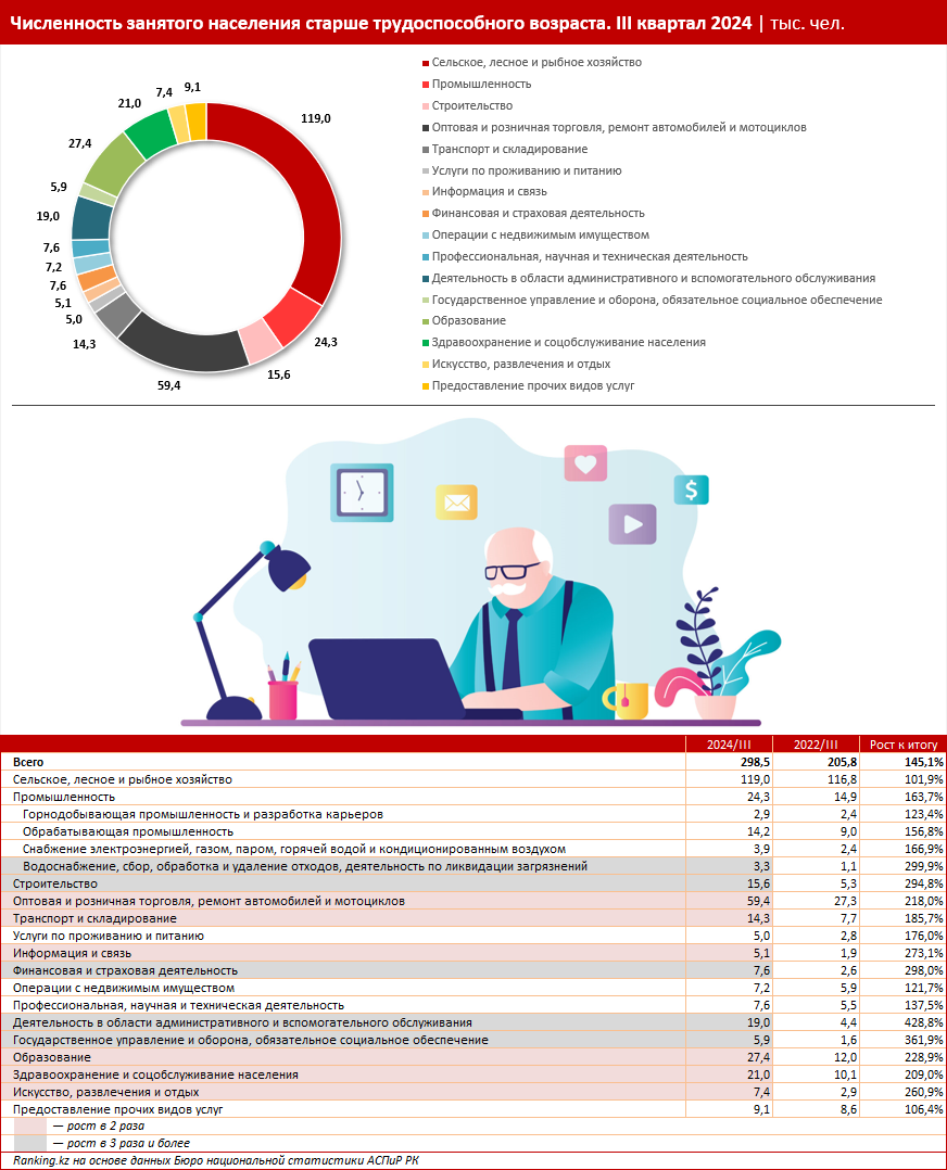 По итогам сентября 2024 года в экономике было занято 298,5 тыс. казахстанцев старше трудоспособного возраста — на 92,7 тыс. человек больше, чем за аналогичный период 2022-го, передает inbusiness.kz со ссылкой на Ranking.kz.