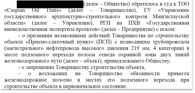 В этой торгово-судебной войне с одной стороны участвует собственник некоторого количества железнодорожных путей, которого назовем региональный перевозчик, а с другой – ТОО Caspian Oil Trans, которое строит "Приемо-сдаточный пункт (ПСП) с подводящим трубопроводом".