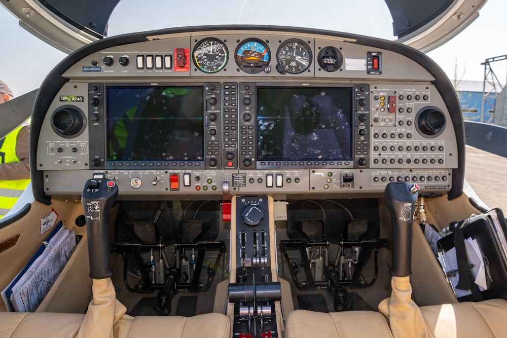 Современный легкий самолет австрийской компании Diamond Aircraft Industries оснащен "стеклянной" кабиной, то есть вместо аналоговых стрелочных приборов здесь используются экраны, на которые может выводиться различная информация, например навигационная или техническая.