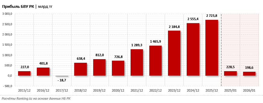 Для справки: за январь 2026-го совокупная прибыль БВУ РК составила 198,6 млрд тг — на 13,1% меньше, однако, чем годом ранее.