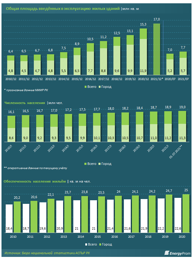 Темпы застройки многократно превышают в РК темпы роста населения. Так, по итогам семи месяцев текущего года в эксплуатацию уже введено 7,7 млн кв. м жилья – на 10,3% больше, чем годом ранее. При этом три четверти общего объема сданы в городах: 5,7 млн кв. м, плюс 9,8% за год. Всего в текущем году планируют ввести в эксплуатацию более 17 млн кв. м жилья – это новый рекордный показатель. Для сравнения: за 2020 год сдали 15,3 млн кв. м жилья – сразу на 16,7% больше, чем в "докоронакризисном" 2019 году.