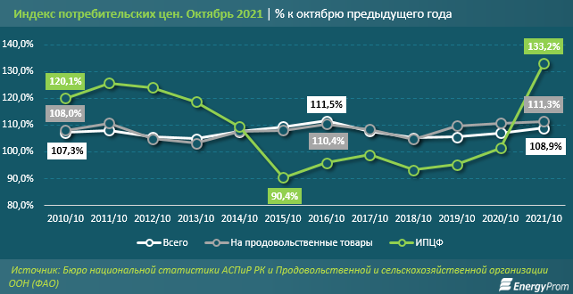 Примечательно, что в прошлый период заметного удорожания продовольствия ситуация касалась именно РК и соседей по ЕАЭС. Так, годовая инфляция в Казахстане в октябре 2015-го и 2016 годов составляла 9%–11%, рост цен на продовольственные товары — 8%–10%. В то же время индекс ФАО держался ниже 100 пунктов (95,9% в 2016-м и всего 90,4% — в 2015-м). Текущая же ситуация со взлётом цен на еду — глобальная.