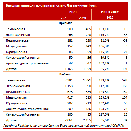 Выбыло 2,4 тыс. специалистов технической направленности, 1,2 тыс. экономистов, 678 педагогов, 417 медиков, 282 юриста, 209 архитекторов, 100 работников АПК.