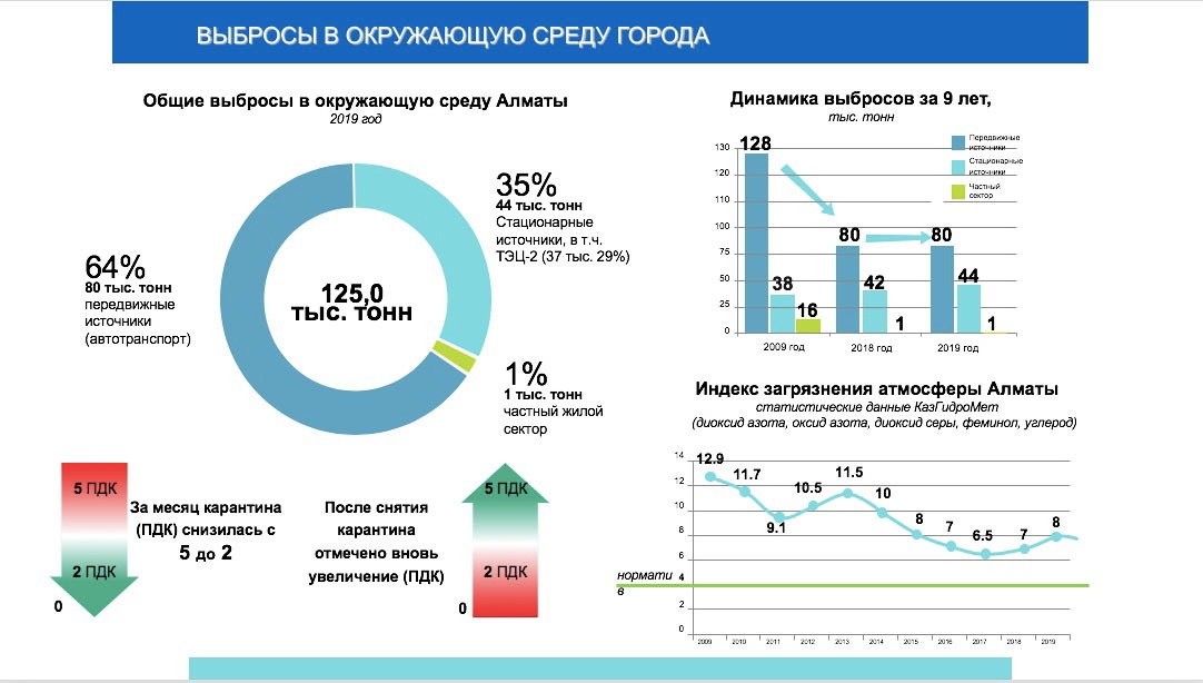 Обеспокоенный этим вопросом алматинский акимат в сентябре утвердил план мероприятий на посткоронавирусную эпоху. "Экологическое благополучие Алматы является одним из главных приоритетов в работе акимата", – говорится в презентации "О мерах по улучшению экологической ситуации в Алматы", датированной сентябрем 2020 года. Inbusiness.kz изучил этот документ.