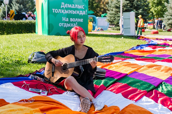 Сегодня алматинский Парк первого президента напоминал огромный калейдоскоп красок. Ведь уже по традиции именно здесь День города отмечается яблочным фестивалем. Но в этот день к палитре яблочных цветов добавилась и огромная пёстрая лента национального казахского лоскутного одеяла – корпе.