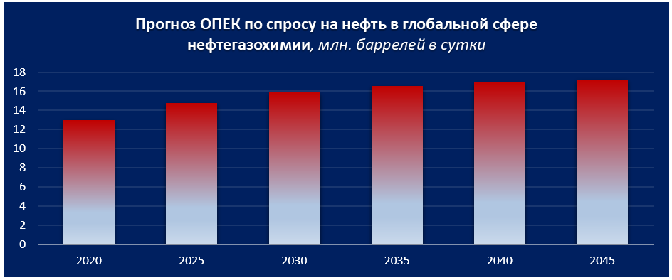 В-четвертых, продолжится активный рост потребления нефти в сфере нефтегазохимии. Согласно оценке, в ближайшие 25 лет соответствующий спрос вырастет более чем на треть.