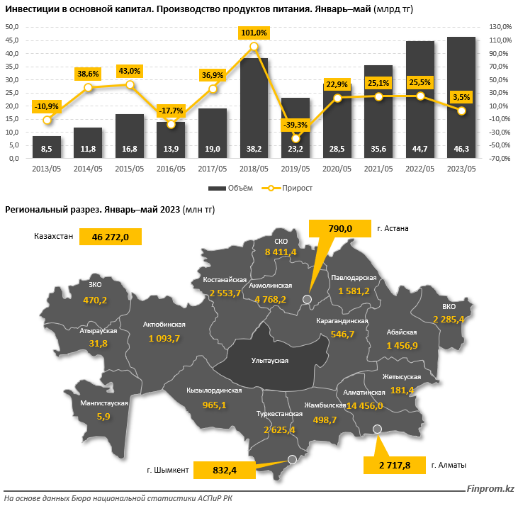 Инвестиции в основной капитал в сфере производства продуктов питания за январь-май 2023 года составили 46,3 млрд тенге, что в денежном выражении на 3,5% больше по сравнению с январем-маем 2022 года (ИФО — 101,7%). Ранее три года подряд объем инвестиций в секторе в аналогичном периоде показывал годовой рост свыше 20%, передает inbusiness.kz со ссылкой на Finprom.