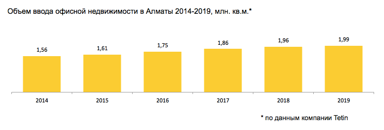 "Рынок перегрет, но бизнесмены продолжают строить новые БЦ. Сегодня общая площадь офисных помещений класса А, В и С в Алматы составляет 1,99 млн кв. м, в Нур-Султане – 1,12 млн кв. м, из них примерно 17-19% – свободные площади. За год в Нур-Султане ввели в эксплуатацию два бизнес-центра класса B общей площадью 43 тыс. кв. м, продолжается строительство еще пяти БЦ. Крупным игроком станет многофункциональный комплекс Abu Dhabi Plaza площадью 512 тыс. кв. м с объемом офисов класса А в 124 тыс. кв. м. В этом году владельцы крупнейших бизнес-центров снизили стоимость аренды примерно на 5% к уровню 2018 года. После начала работы Abu Dhabi Plaza средняя арендная ставка офисов класса А может упасть еще на 10%", – прогнозирует Лев Тетин.