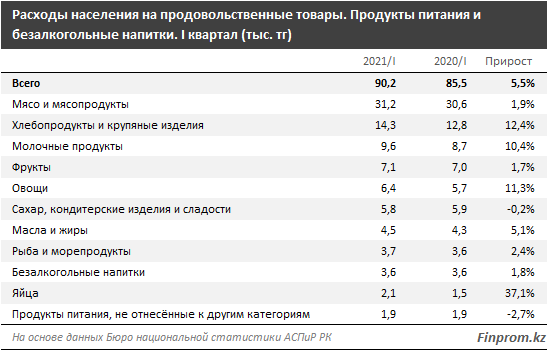 В первом квартале 2021 года расходы казахстанцев на продовольственные товары составили 96,7 тыс. тг на душу населения – на 4,6% больше в стоимостном выражении, чем годом ранее, передает inbusiness.kz со ссылкой на портал finprom.kz.