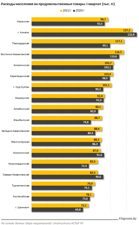 В региональном разрезе наибольшие расходы понесли жители Алматы: 127,2 тыс. тг, минус 4,2% за год. В тройку регионов, жителям которых пришлось тратиться на продовольствие больше всего, вошли также Павлодарская (117,1 тыс. тг, плюс 18,1% за год) и Восточно-Казахстанская (116,5 тыс. тг, плюс 5,3%) области.