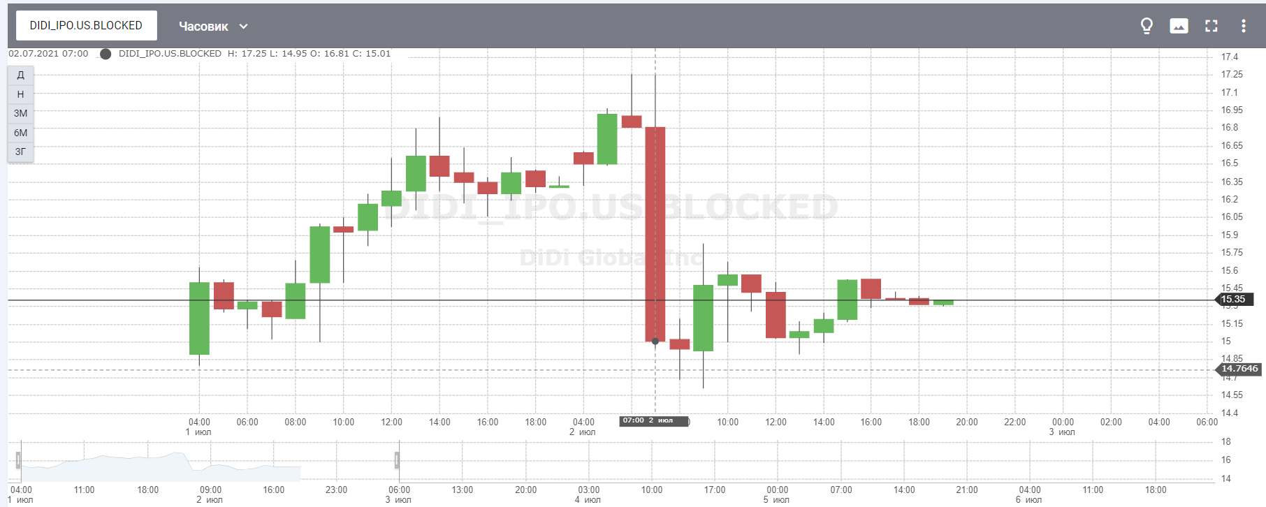 Однако не долго музыка играла. На премаркете 2 июля в четыре утра по североамериканскому восточному времени торги по DIDI.US открылись с отметки 16,5 доллара, достигая на high часа 16,97 доллара за акцию.